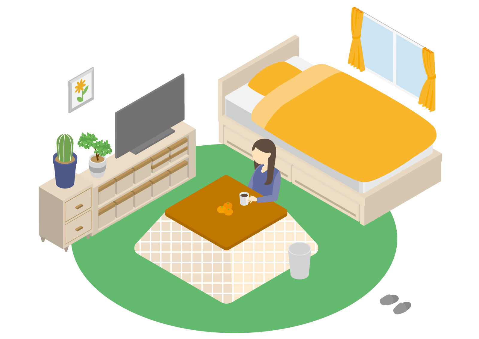 こたつ周りは冬の生活の中心地となります。ここがごちゃついていると、冬の間ずっと片付けられないストレスに悩まされます。理想は、“旅館や温泉の休憩室のように何もない、すっきりとした空間”を作ること。広いスペースを確保してからレイアウトを考えると、こたつ生活の快適度はまったく違ってきます。