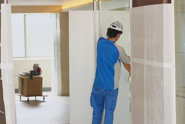 作業現場はマンションの11階ということもあり、まずはエレベーターや共用部分の廊下にしっかりと養生を施し、施設を傷つけないよう細心の注意を払うことからスタートしました。
