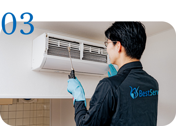 エアコン本体から部品を分解し、カビや汚れをオリジナルの洗剤で洗浄。きれいな状態が長持ちするように、全ての洗浄で防カビ仕上げをしております。
