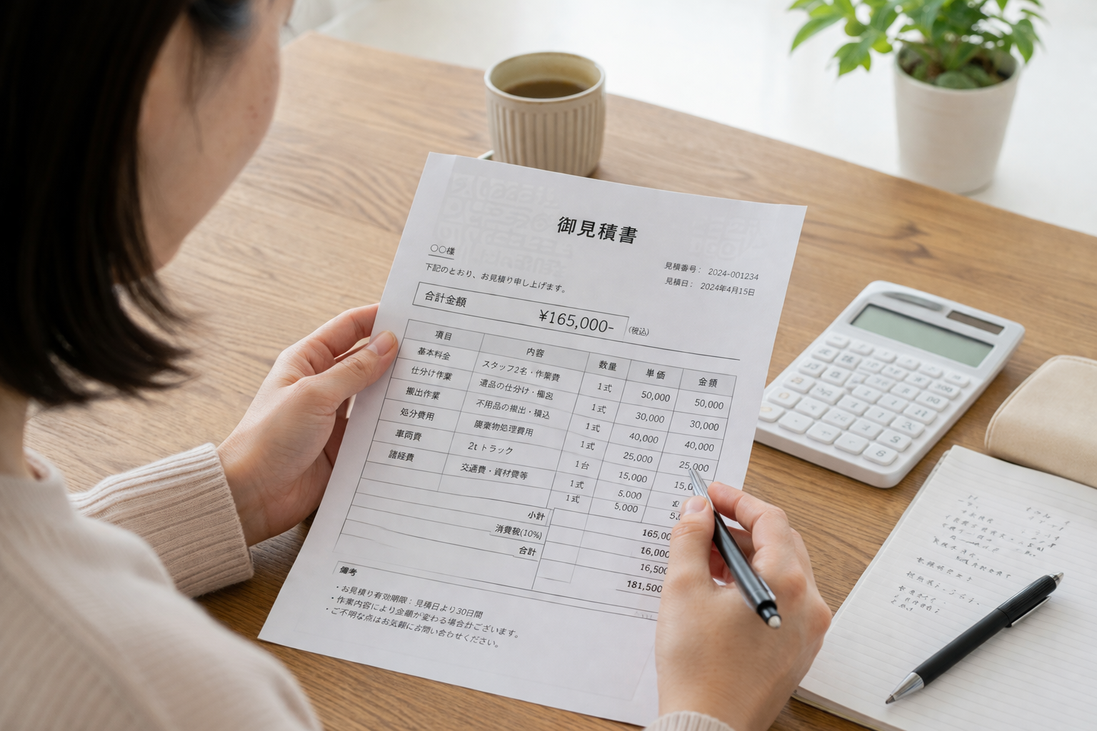 見積書は遺品整理の費用を詳細に把握するための重要な資料です。料金内訳を確認する際には、「基本料金」「人件費」「処分費」「車両代」などの項目が明確に記載されているかをチェックしましょう。特に注意したいのは、追加料金が発生する可能性がある場合や曖昧な説明です。具体的な作業内容や提供されるオプションも合わせて確認することで、見積書の内容を正確に理解でき、後のトラブルを回避しやすくなります。