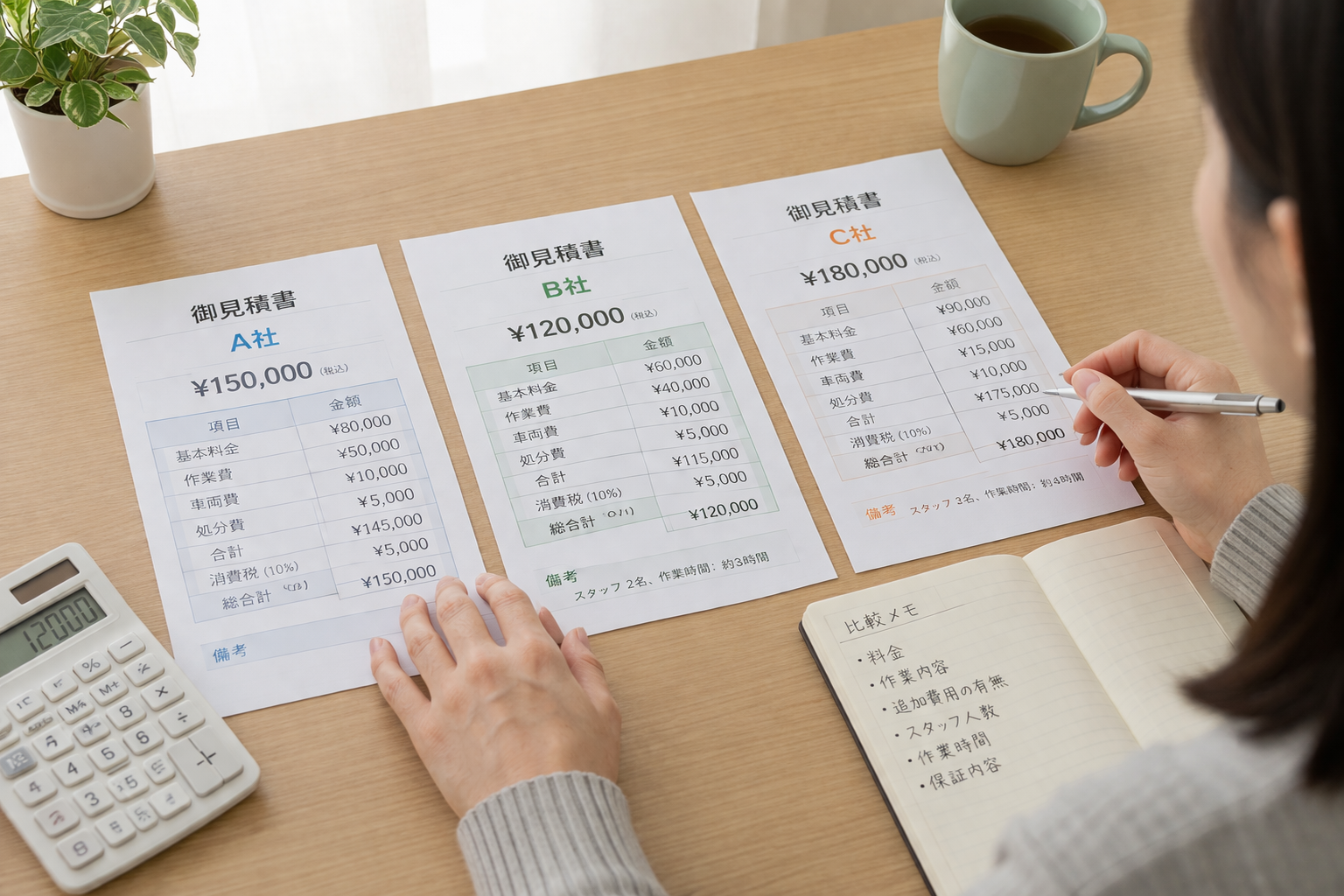 遺品整理を依頼する際には、複数の業者から見積もりを取る「相見積もり」が非常に重要です。相見積もりを行うことで、適正な料金相場を把握できるだけでなく、業者ごとのサービス内容の違いや対応の質を確認することができます。また、不必要な追加料金が発生していないかを検討する材料にもなります。必ず複数の業者に見積もりを依頼し、それぞれの提示する価格や内容を比較することが、失敗を防ぐ第一歩です。