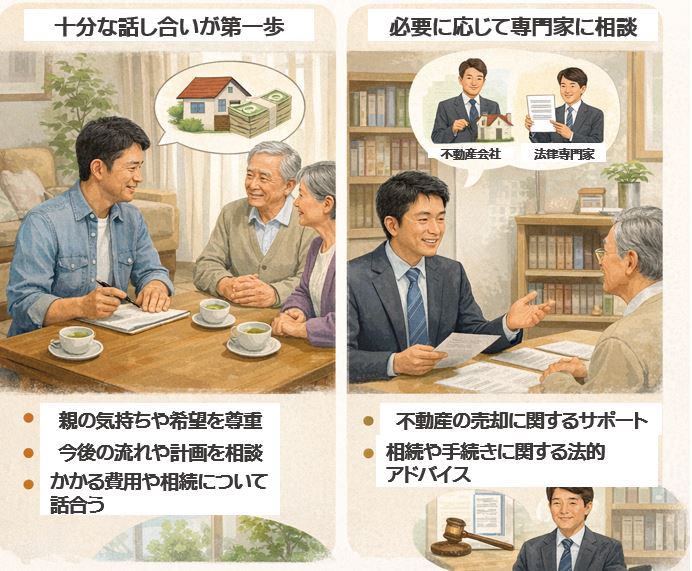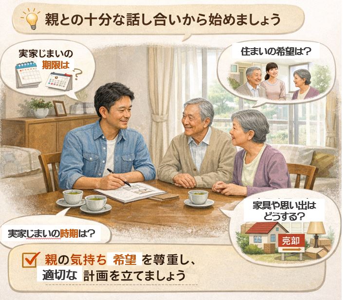 実家じまいを円滑に進めるためには、親の気持ちを深く理解し、尊重することが何よりも重要です。高齢になると、親にとって実家は単なる建物ではなく、思い出の詰まった大切な場所となります。そのため、親が抱く感情や考えを否定することなく、共感しながら話を進める姿勢が求められます。親の意見を聞くことは、彼らの安心感や信頼感にもつながり、このプロセスの成功を左右する大きな要素となります。