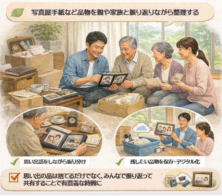 実家じまいを進める中で、どのように思い出を整理するかも大切なポイントです。写真や手紙などの品物は、親や家族と一緒に振り返りながら分別することで、単なる片付けではなく、思い出を共有する有意義な時間に変えられます。また、アルバムを作ったりデジタル化したりすることで、思い出を形に残す方法も検討すると良いでしょう。これにより、感情面でも満足感を得ることができます。