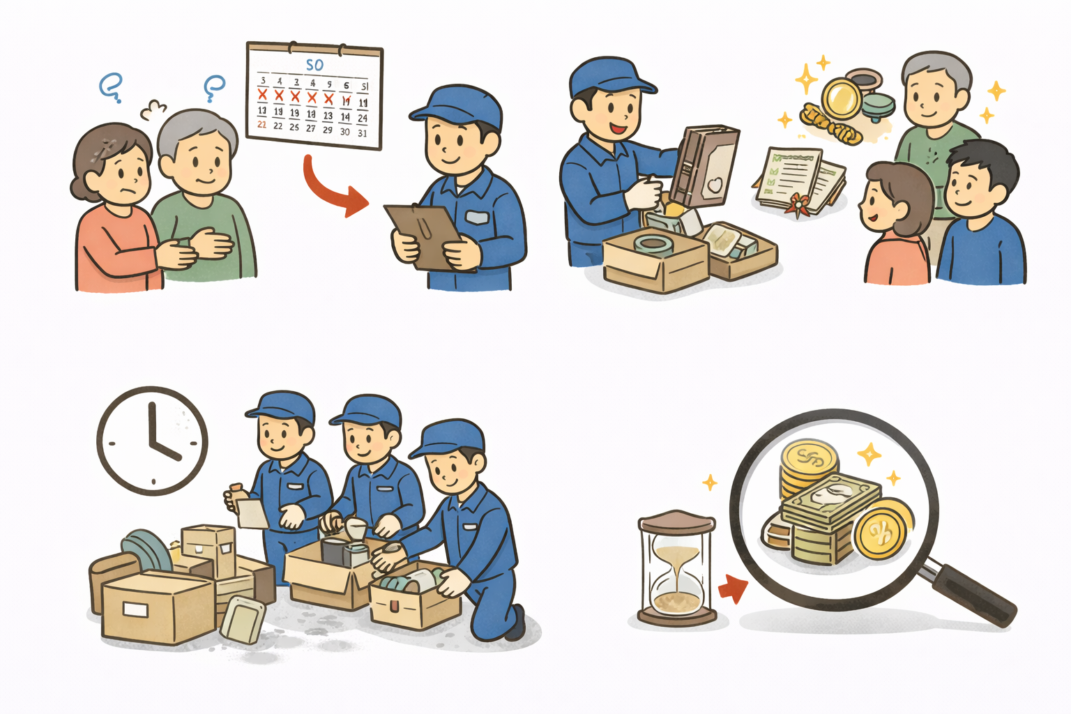 プロの遺品整理業者は、上記のような仕分けを迅速に行うだけでなく、「ご遺族が気づかなかった価値」を見つけ出すプロでもあります。自分たちだけで行うと数ヶ月かかる作業を1〜2日で終わらせることができるため、遺産分割協議の期限(相続税申告がある場合は10ヶ月以内)を意識したスピード感のある対応が可能です。
